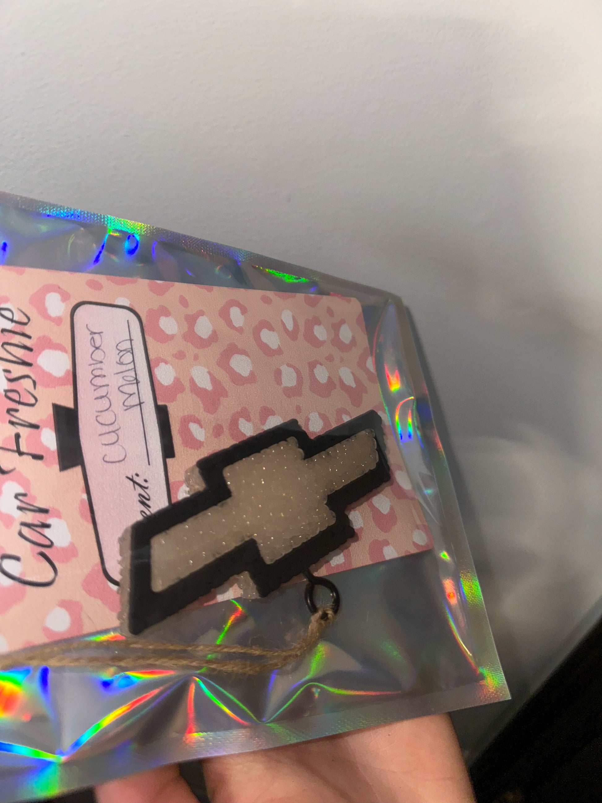 4’W x 1.5”L - Chevy emblem shaped aroma bead car air freshener. Decorated in theme of Chevys classic colors, the iconic gold as the base outlined in black! Choose your scent, descriptions as always are pictured above!