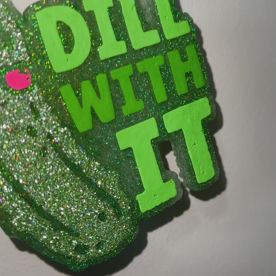 4.75”W x 4.5”L: “Dill With It” pickle themed car air freshener made out of pre scented aroma beads. Decorated in different shades of green with lots of glitter! Perfect for any pickle lover, choose your favorite scent descriptions pictured above!
