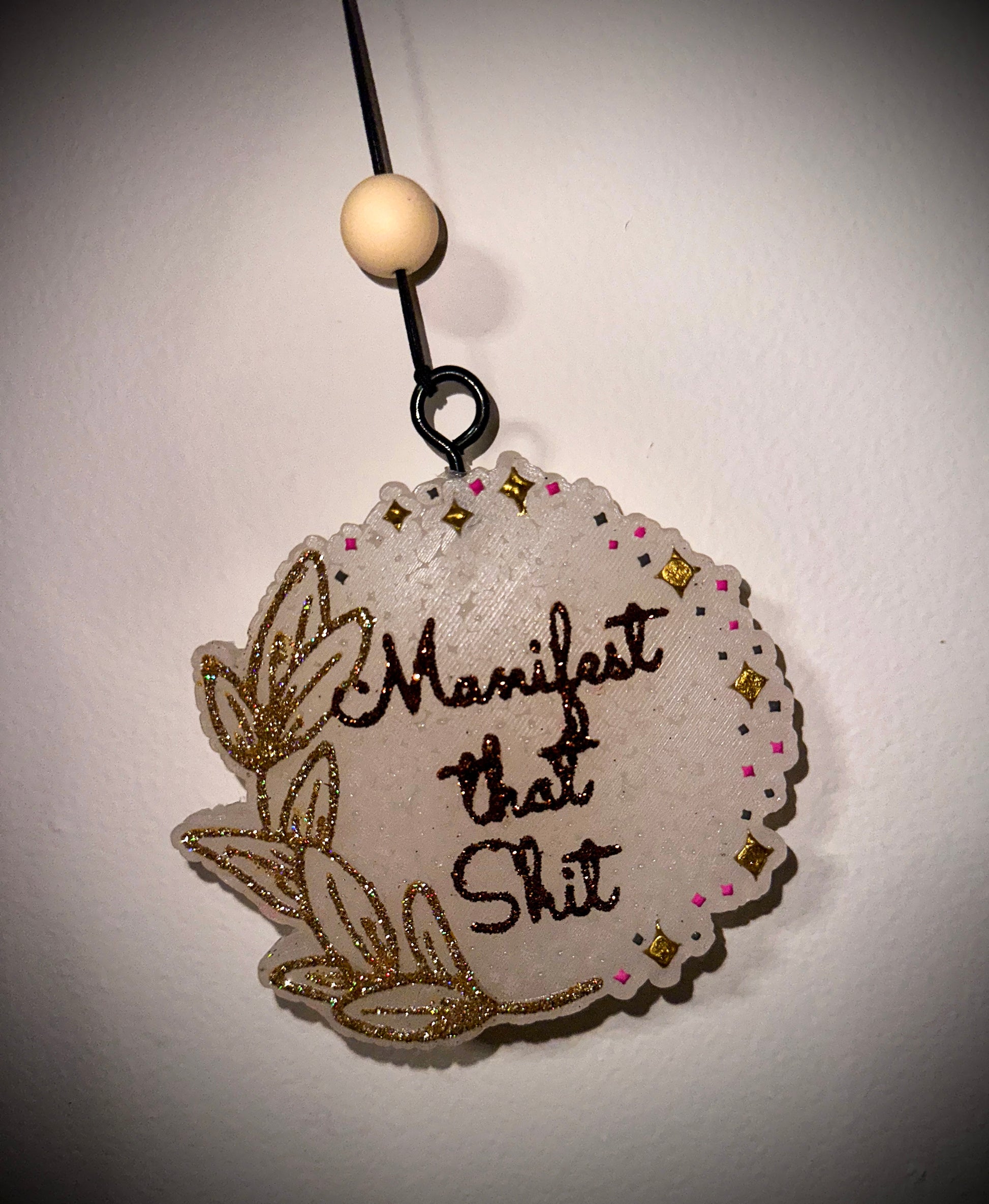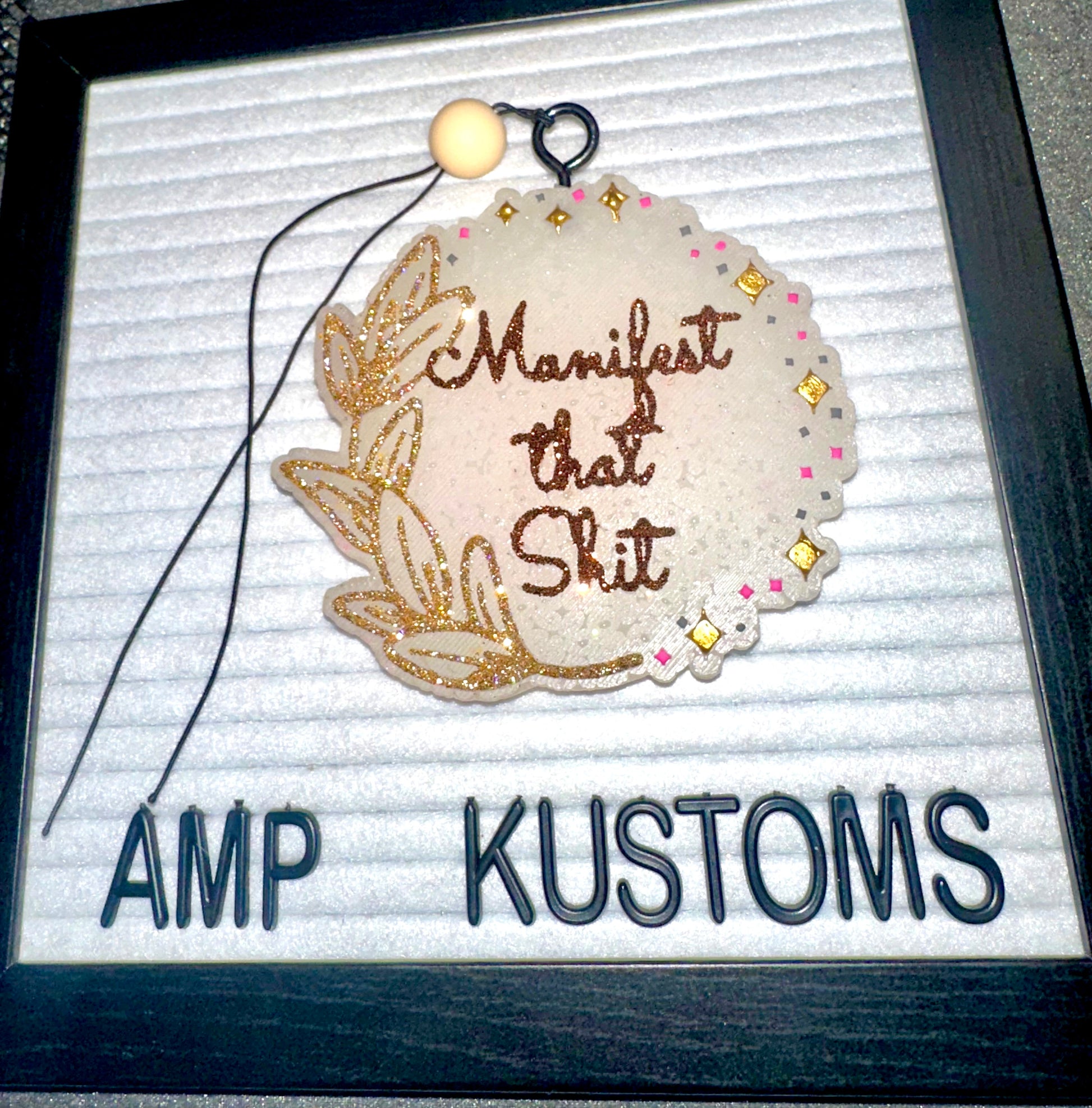 4”W x 4”L- “Manifest That Shit” Car freshener, made out of pre-scented aroma beads. Decorated with an elegant yet bold scheme of gold and espresso glitter with hints of pink and gray colors. Choose your favorite scent from the list, descriptions as always are pictured above!