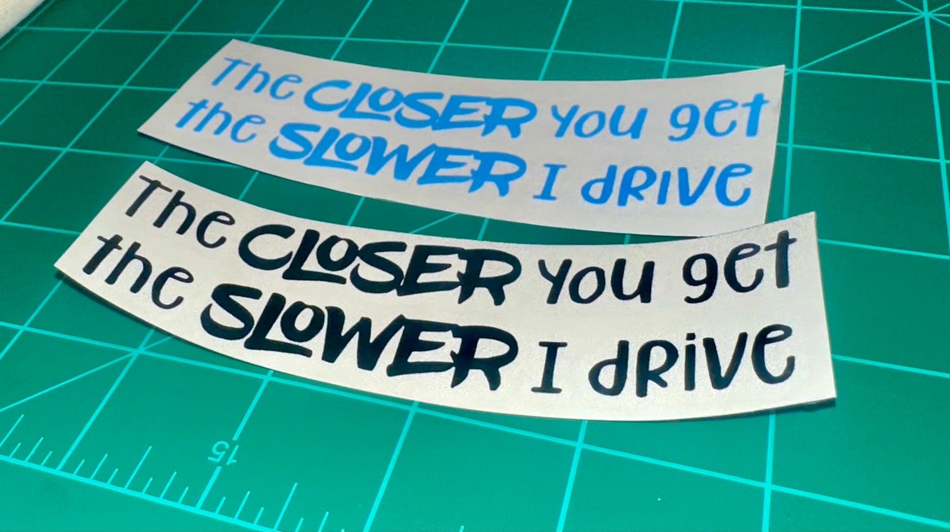 Funny driving decal sticker, “The closer you get, the slower I drive”. Choose your size and color, pictured above are all the colors options! If you do not see the exact size or color/pattern you would like please reach out to contact@ampkustoms.org and we can see what we can make happen!